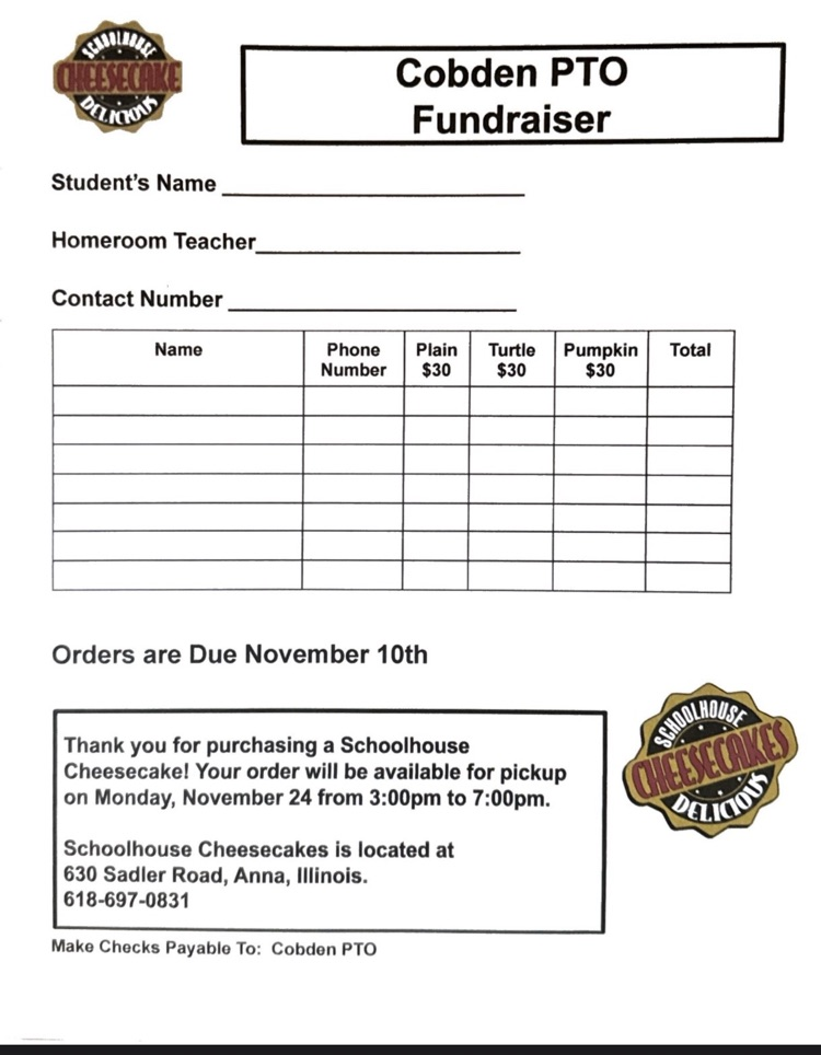 Last Chance to Order Your Schoolhouse Cheesecakes! Support the Cobden PTO by placing your order by Monday, November 10th. Orders will be available for pickup on Monday, November 24th, from 3:00–7:00 PM at Schoolhouse Cheesecakes, located at 630 Sadler Rd, Anna, IL. Don’t miss out on these delicious treats and a great way to support our school!